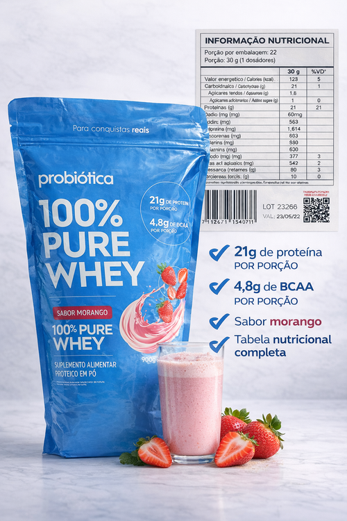 100% Pure Whey Probiótica – Sabor Morango | 21g Proteína por Porção | 900g